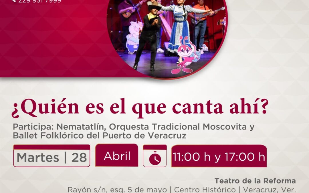 La Secretaría de Cultura de Veracruz, en colaboración con la Dirección General de Difusión Cultural de la Universidad Veracruzana (UV), invita a la presentación artística ¿Quién es el que canta ahí? el próximo martes 28 de abril, en funciones de 11:00 y 17:00 horas, en la Sala Principal del Teatro de la Reforma, en el puerto de Veracruz. La entrada es gratuita.